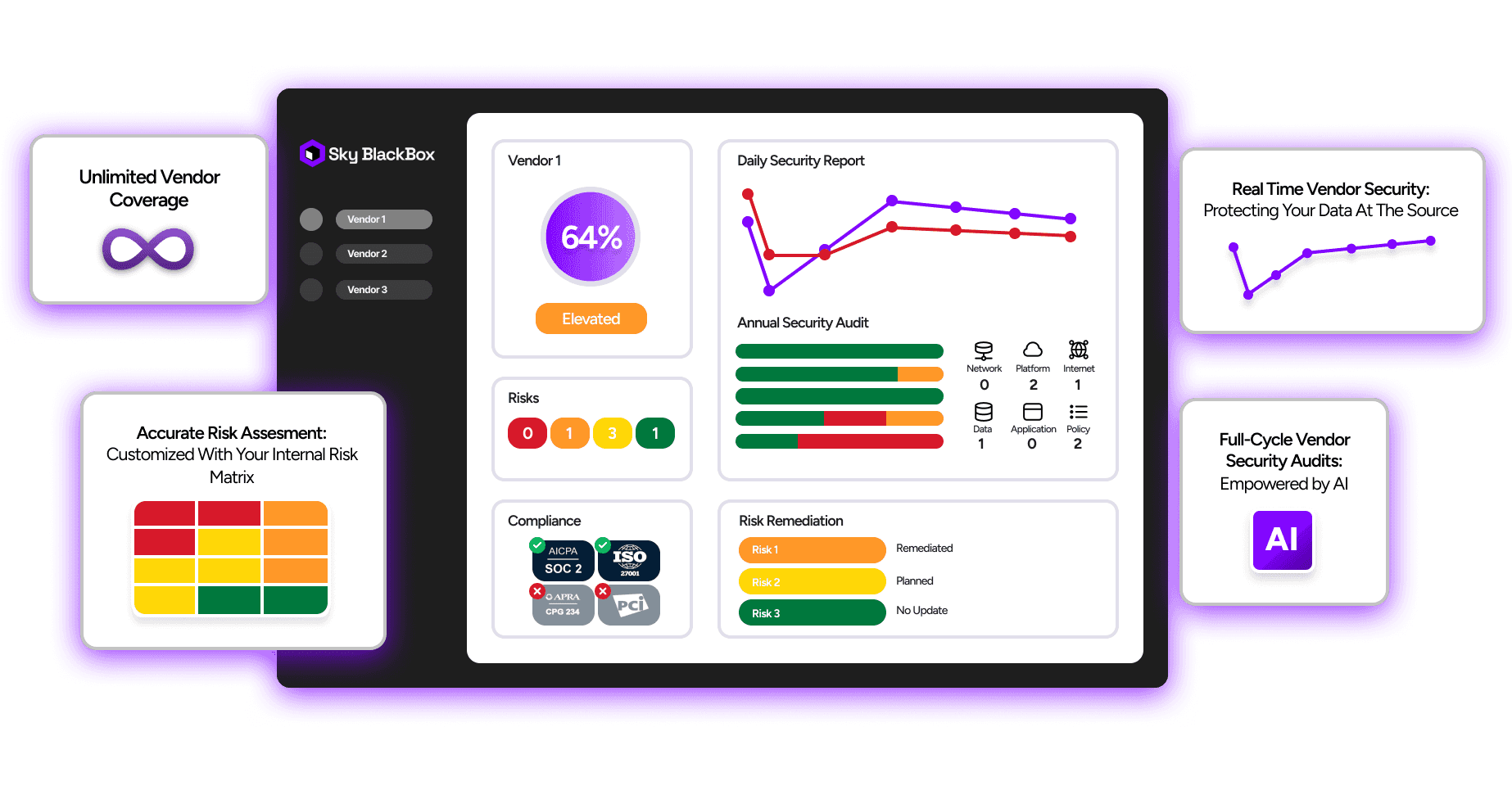 Experience the future of vendor risk management with Sky BlackBox, offering 470 times more accuracy than traditional methods. Alongside yearly assessments, our solution provides daily security reports directly from the heart of your vendor’s systems, ensuring comprehensive data and privacy protection.