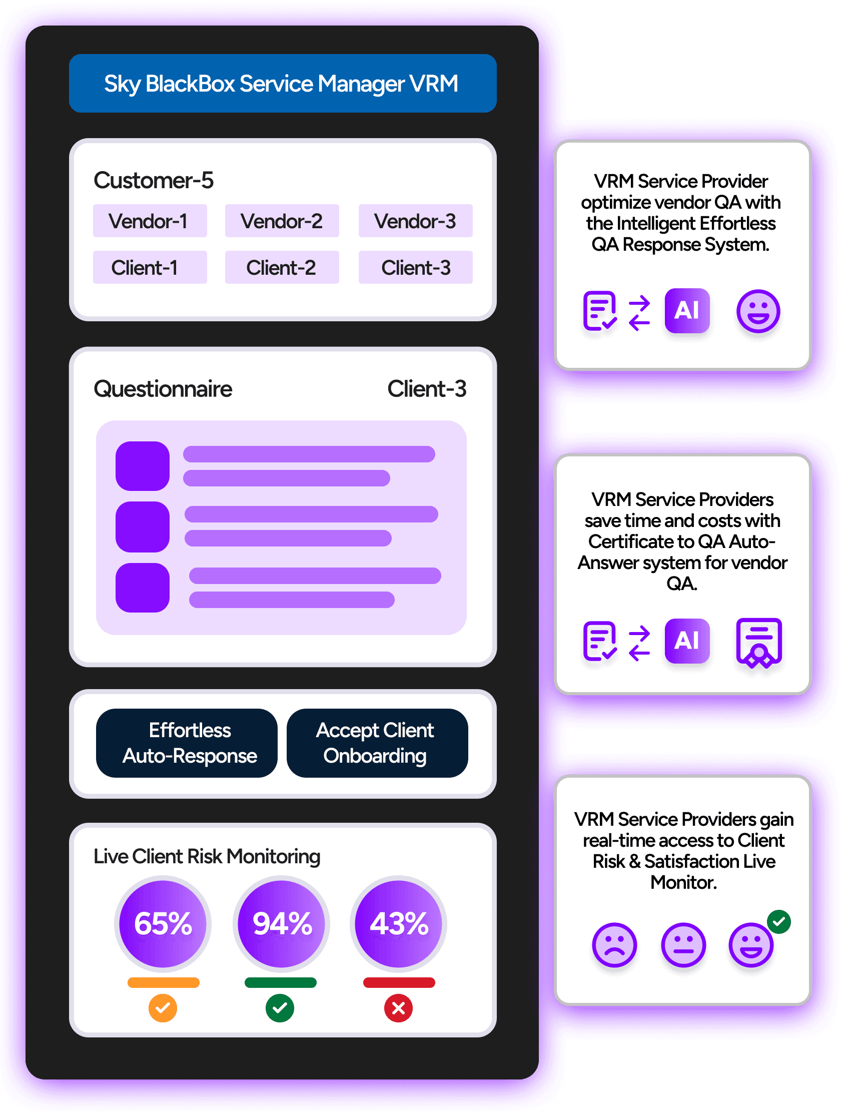 Sky BlackBox is AI-empowered Vendor Risk Management that maximizes security while minimizing effort. With a suite of three integrated apps, it addresses VRM challenges for clients, vendors, and service providers. Offering 470x more accuracy, 6x lower operational costs, and 9x faster results compared to traditional methods.